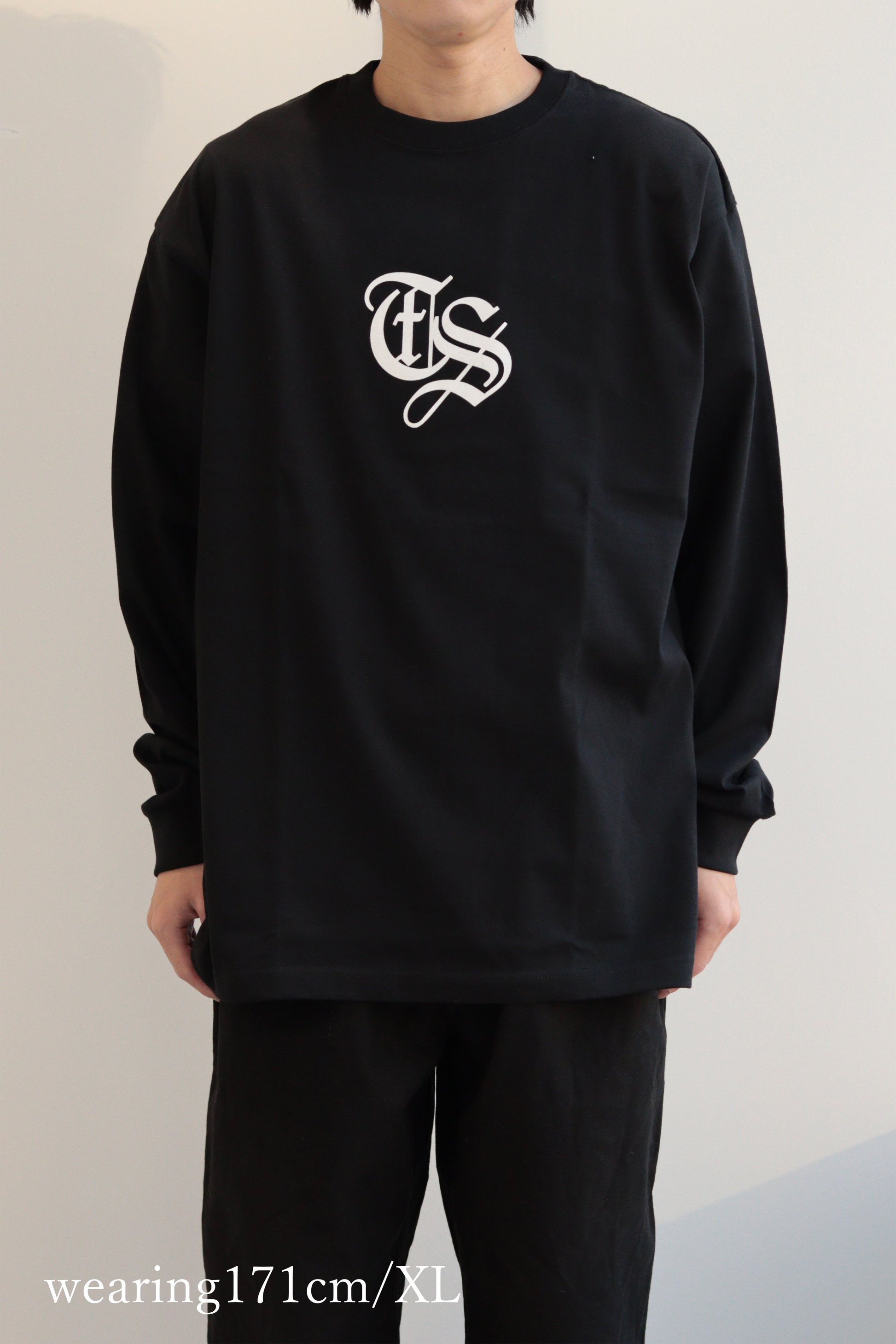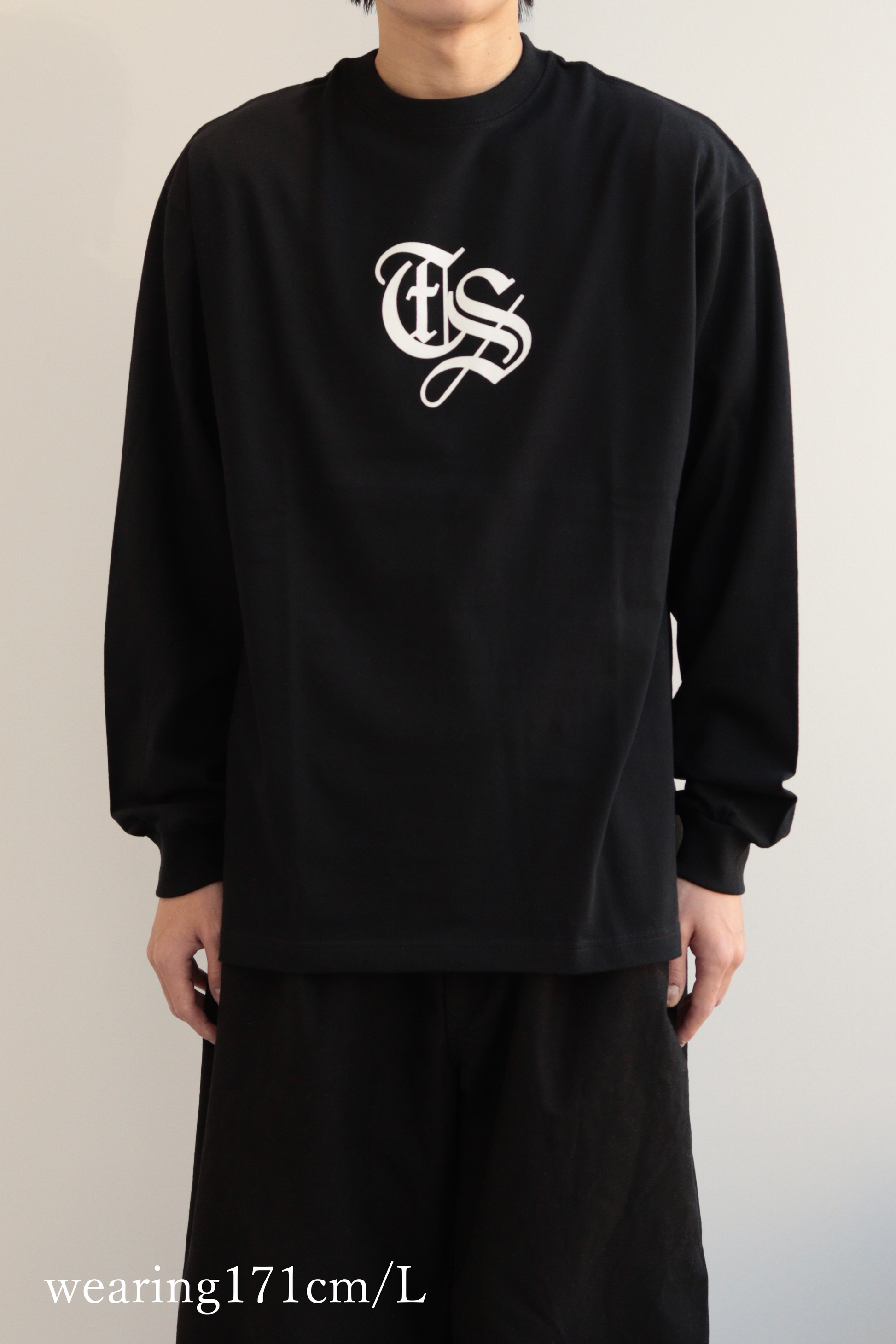 深みのあるブラックボディにホワイトのオールドイングリッシュロゴ(TS)を刺繍した、存在感のあるロングスリーブTシャツ。